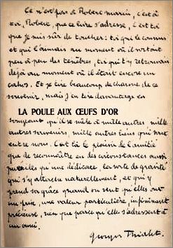 En fin du mois Georges Poulet publie, sous le pseudonyme de Georges Thialet, son premier roman chez Emile-Paul : La Poule aux œufs d'or, dont il envoie à Denoël un exemplaire de luxe somptueusement dédicacé :
