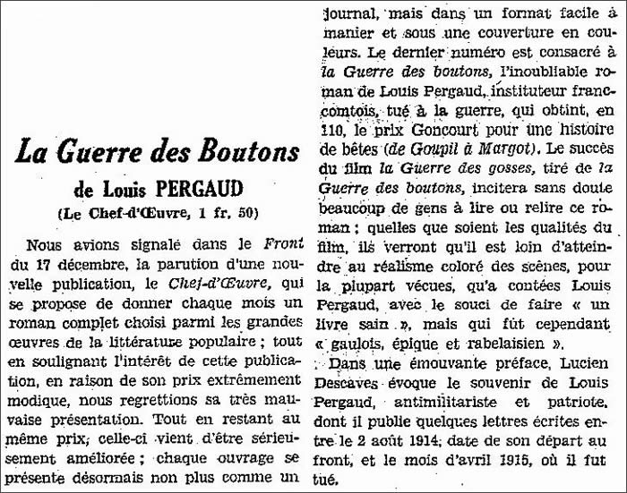 N° 2 : Pergaud (Louis). La Guerre des boutons [n° 1002]
