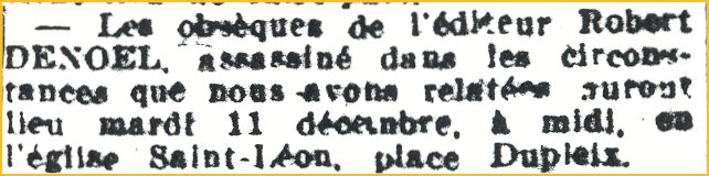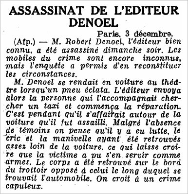 L'éditeur Robert Denoël a été abattu hier soir d'une balle de revolver à l'angle du boulevard des Invalides et de la rue de Grenelle, alors qu'il s'affairait autour de l'automobile que M. Bonnat-Montchrétien [sic], éditeur, lui avait prêtée et dont un pneu venait d'éclater. Il est mort à l'hôpital Necker où il avait été aussitôt transporté.